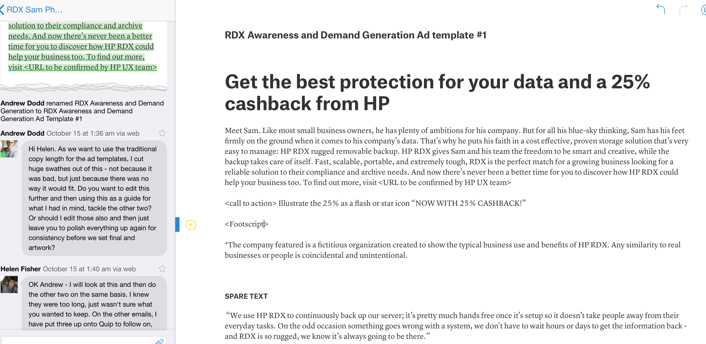 I realised Quip was also transforming my agency workflow whilst working on a new campaign for HP's RDX Removable Disk Storage at the end of 2013. The campaign was conceived quite late in the year and because of holiday schedules, we were under a lot of pressure to get the copywriting phase complete so we could meet deadlines for translation. I am based in Spain, my preferred copywriter, Helen Fisher of WriteStuff, was travelling in Ireland and the design agency creating the campaign, Nutley & Nutley, is based in the UK. And at a critical period, I had to go to Amsterdam for a partner business event!