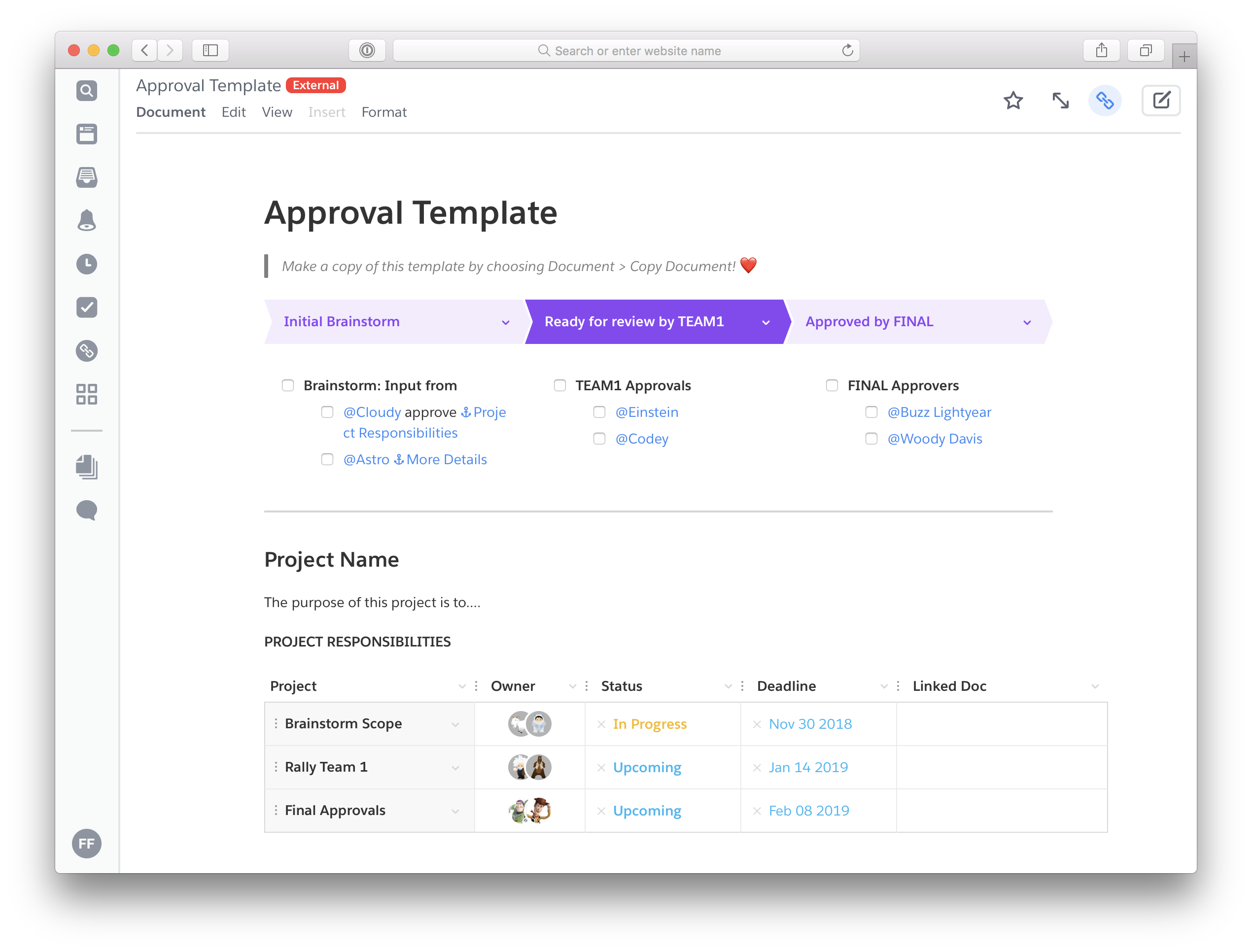 Describe what you're trying to do, then lay out the necessary steps in a dynamic process bar. Use checklist to identify the necessary approvers for each step—when they've given you the go-ahead, they can just check themselves off. Outline the project's roles and responsibilties so everyone knows who to talk to about what. Get the greenlights you need to get amazing things done.