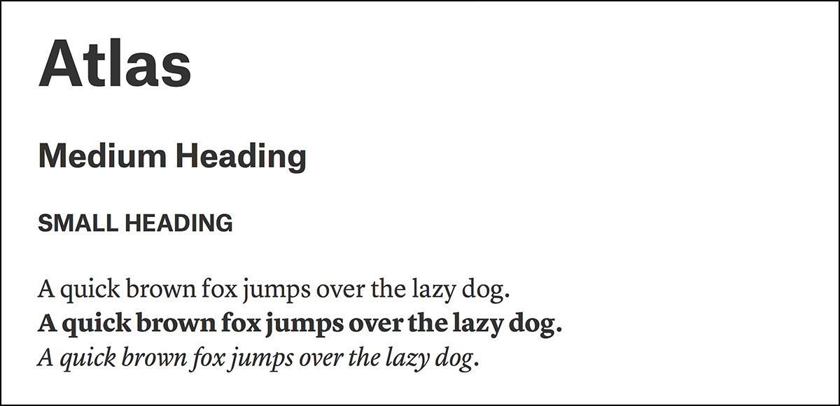 Typefaces: The headings are Atlas Grotesk — a beautiful sans-serif typeface that was inspired by well-known typefaces Helvetica and Mercator. The body copy is Lyon Text — a contemporary serif that looks great on digital interfaces.