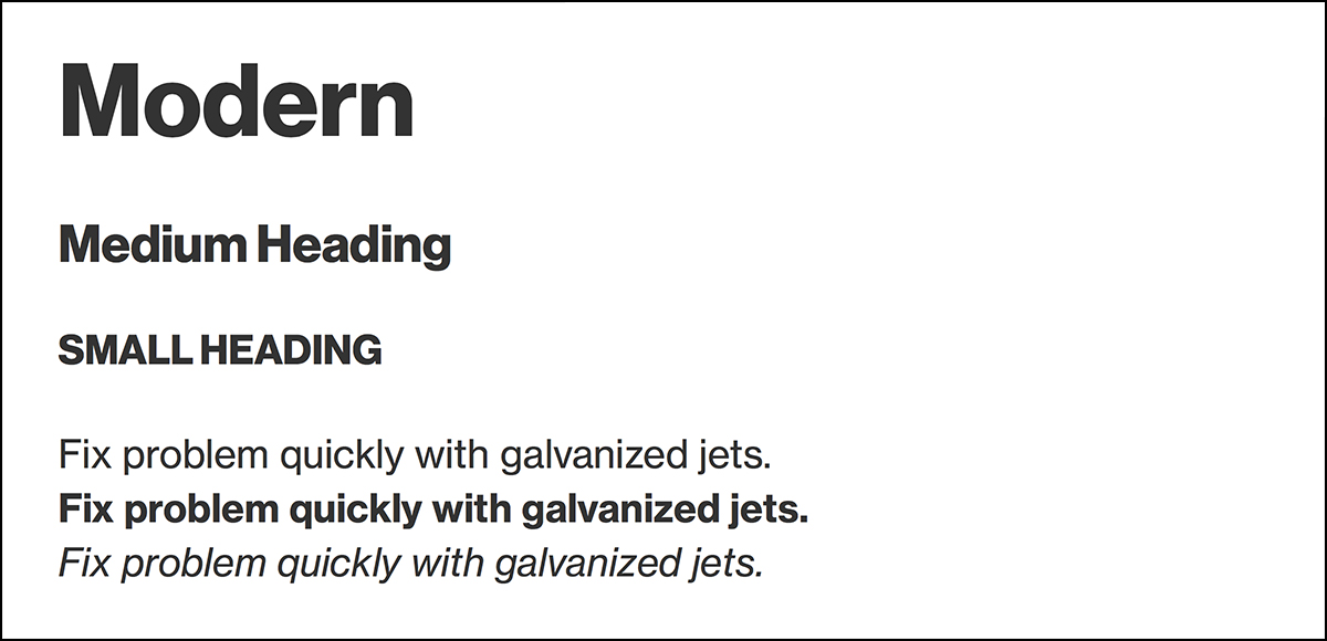 We created the Modern theme for those who prefer sans-serif typefaces and a clean, sleek aesthetic. It uses a revival of Helvetica that retains the character and warmth of the original cut.