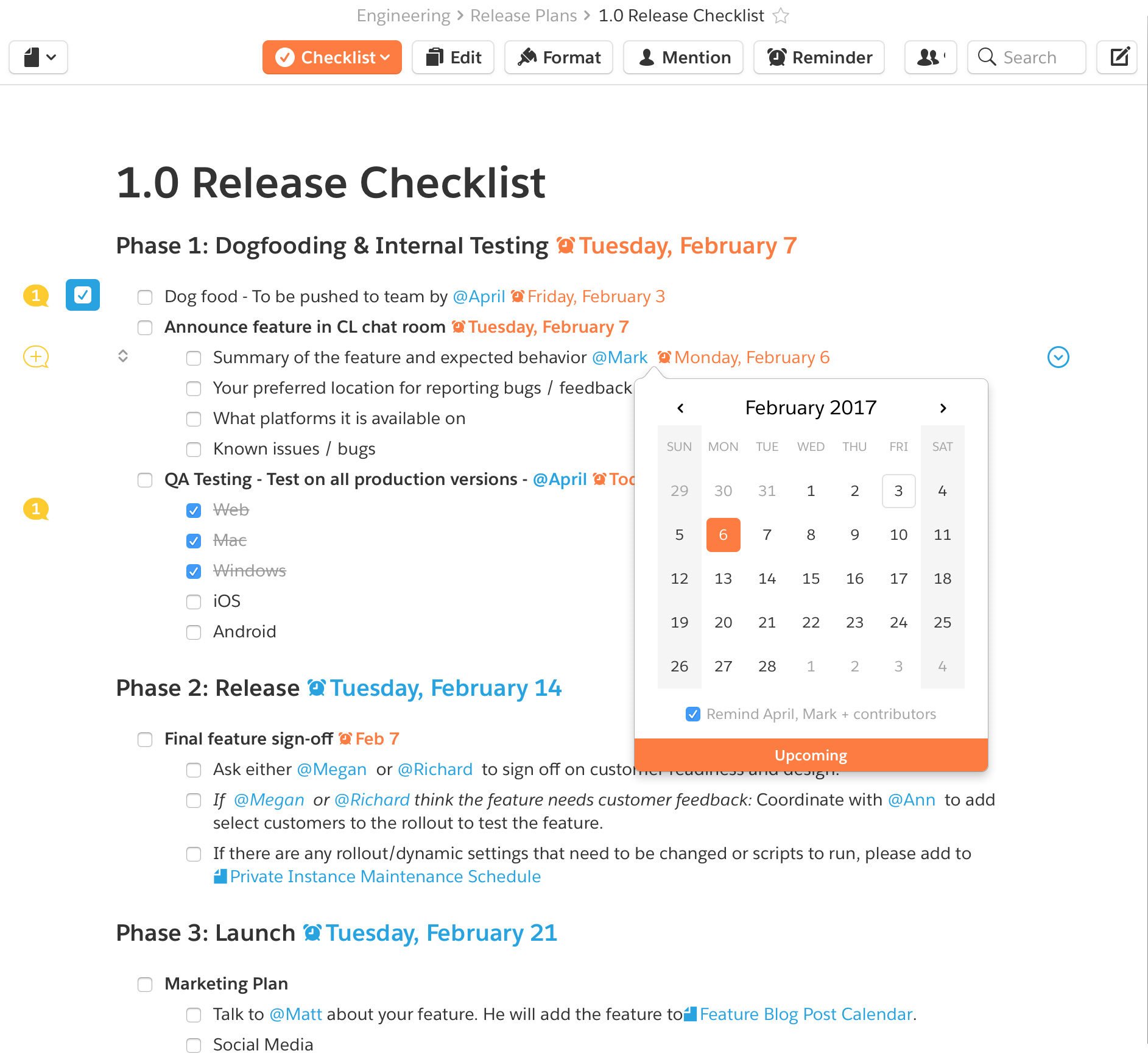 Quip helps you track work efficiently without the burden of project management tools. Create a single-source of truth document where everyone can stay updated on their deliverables. Add checklists, assign owners with @mentions, and use comments and chat to make real-time decisions.