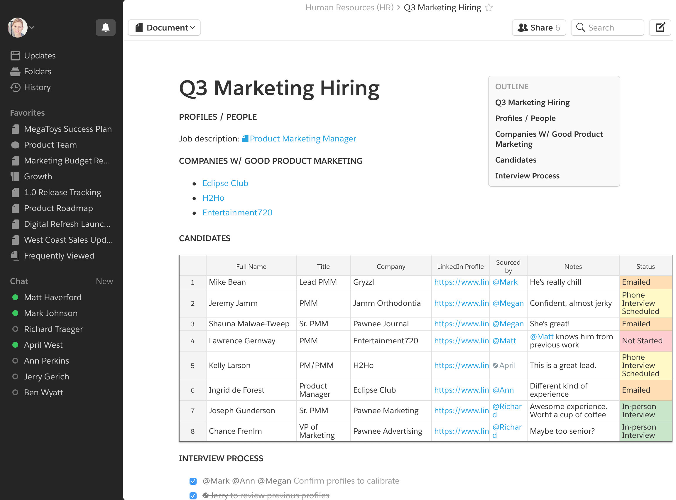 Finding new teammates requires a focused approach, constant coordination, and top-notch communication from your HR team. Quip is the spearhead your team needs to land your next big fish.