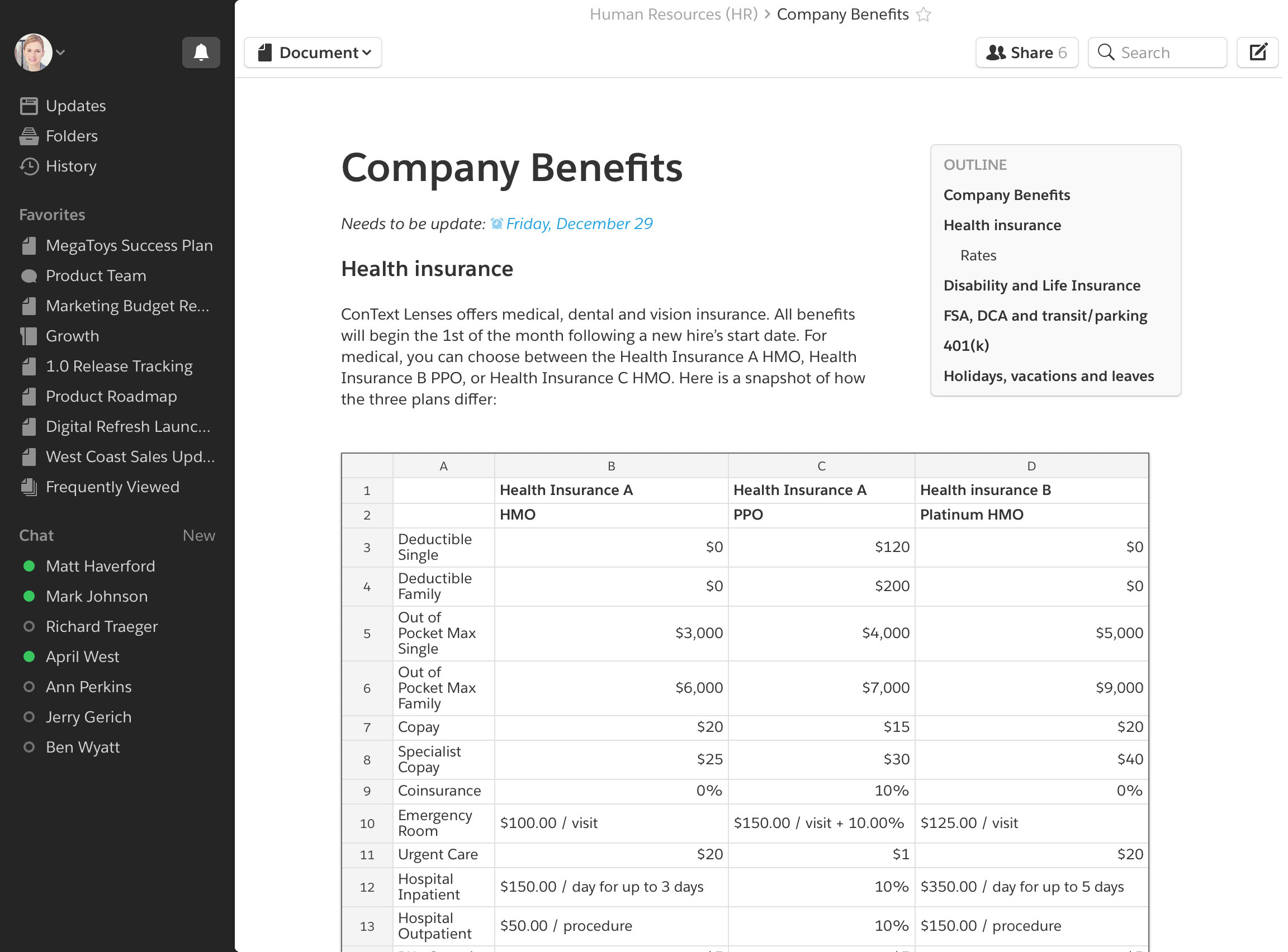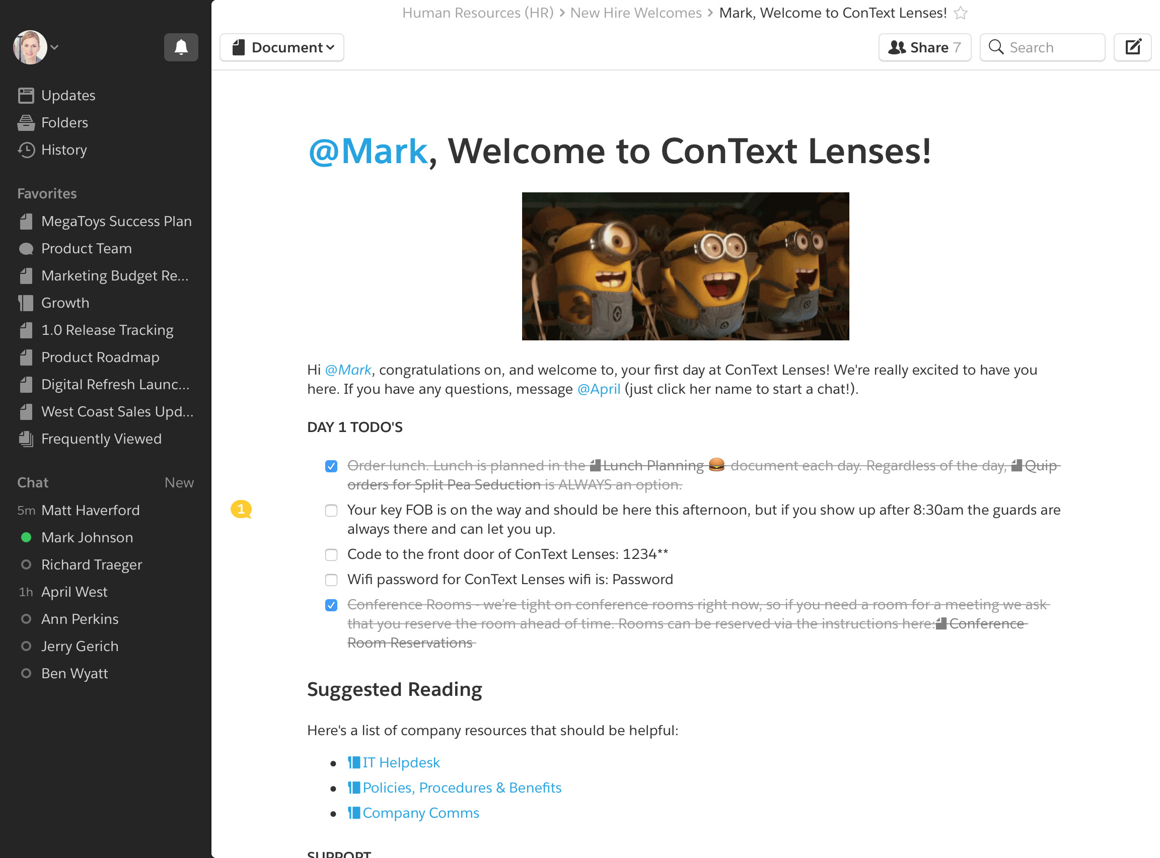 Tired of throwing your new hires into the deep end? Create a welcome document for the resources, important reads, and inflight projects that your new employee needs to get up to speed on. With everything in Quip, your new hire can become a productive veteran in no time.