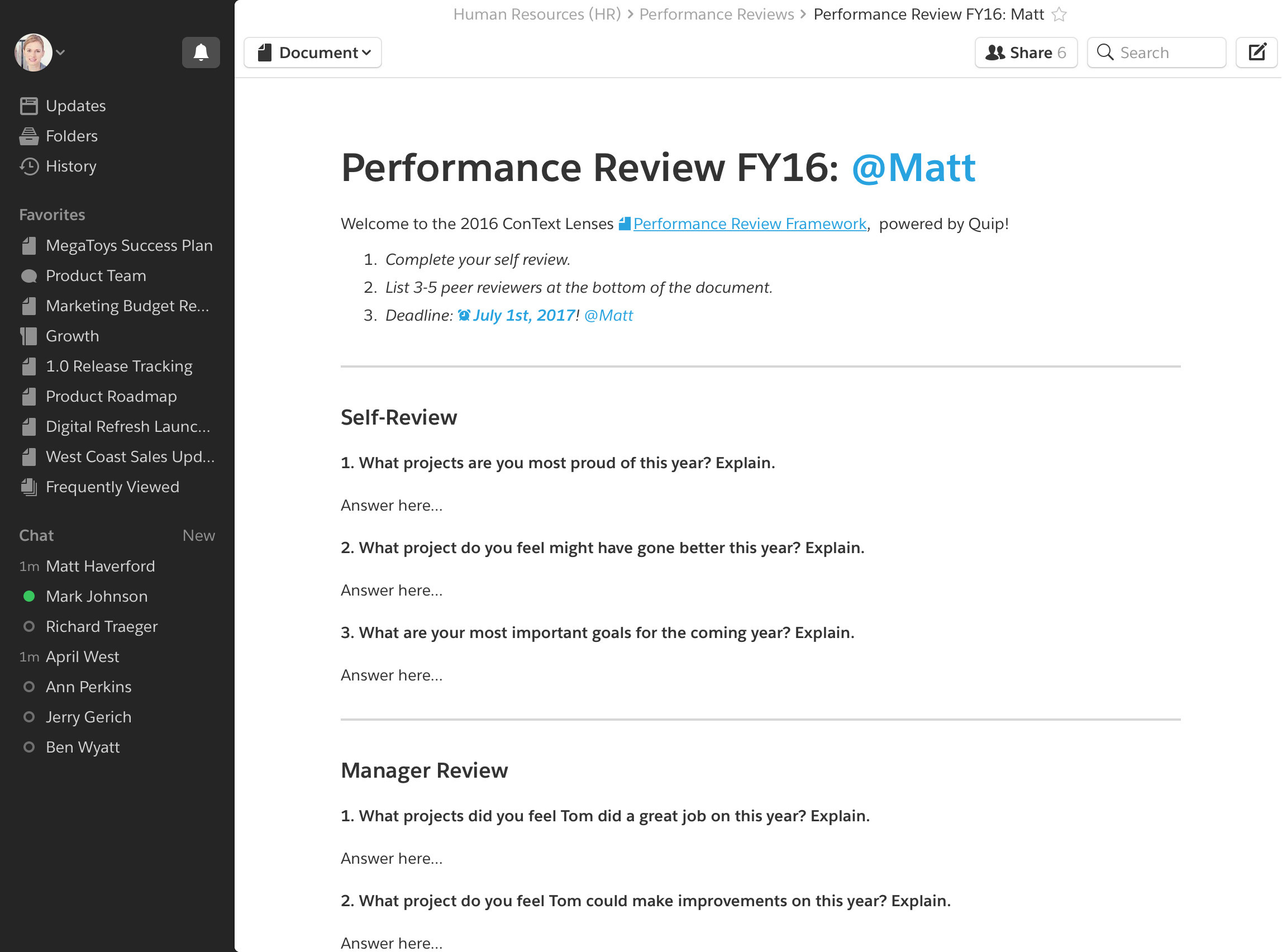 Great organizations have a habit of exchanging valuable feedback that drives every team and relationship forward. Use Quip documents to capture performance reviews between managers and individual contributors, peers, and departments.