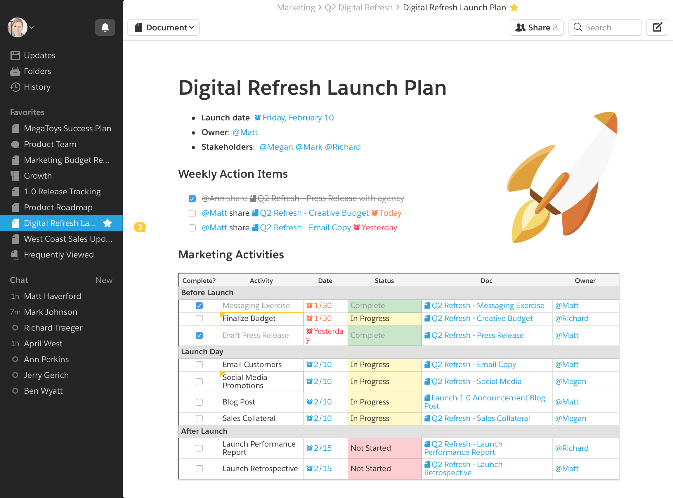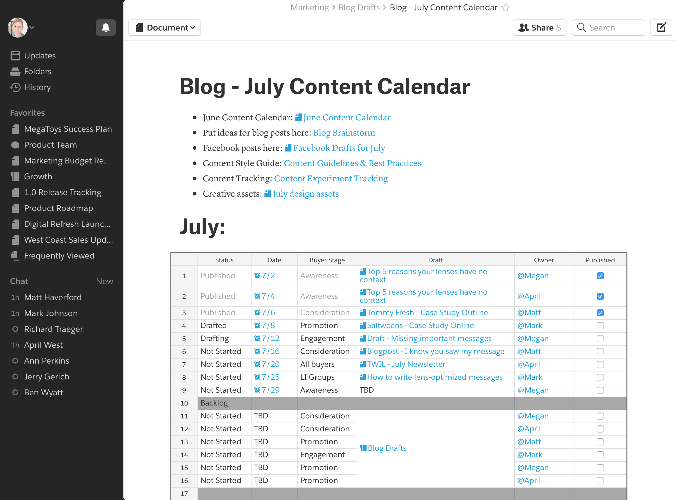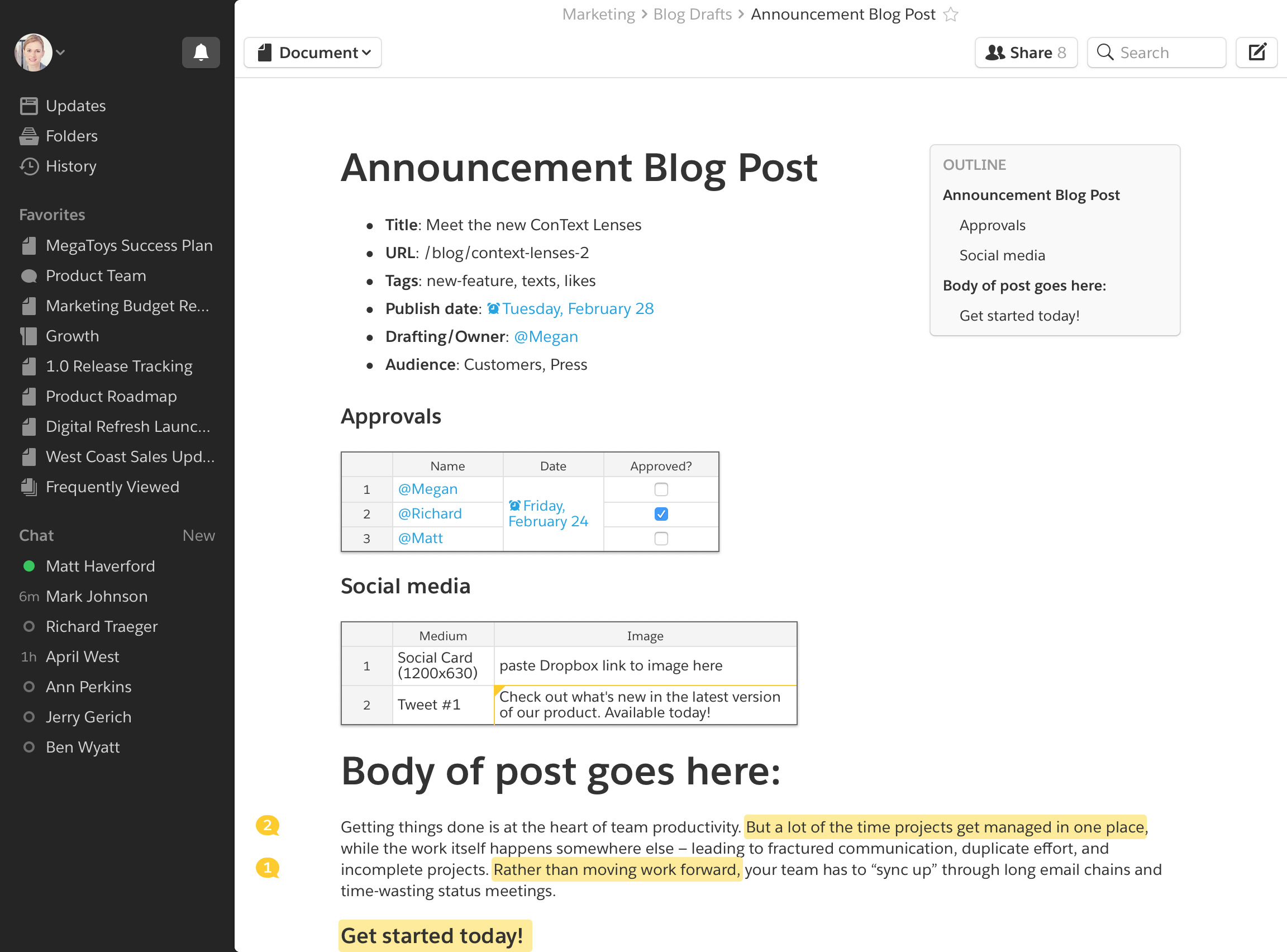 Quip documents are the perfect place to draft website, email, and blog post copy. Your team can review with inline comments so feedback always has context. When it's flawless and approved by the team, you can move your content to your preferred publishing platform for the world to see.
